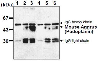| Specificity | This antibody reacts with Mouse Aggrus (Podoplanin). The reference Kato, Y., et al. (2003) described that this antibody does not react to Human Aggrus (Podoplanin). |