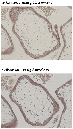 | Recommended Dilution | Immunohistochemistry on Paraffin Sections: 10 μg/ml. Heat treatment is necessary. Microwave oven; 2 times for 15 minutes each in 10 mM citrate buffer (pH 6.0); Autoclave; 10 minutes at 120 °C in 10 mM citrate buffer (pH 6.0) * Recommended activation; Autoclave. Flow Cytometry: 10 μg/ml (final concentration). For details see Protocols below. |